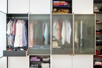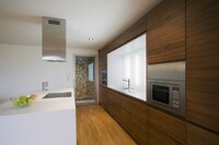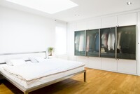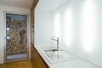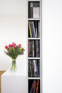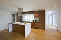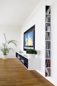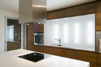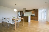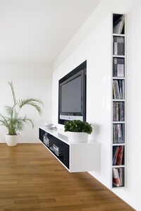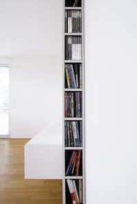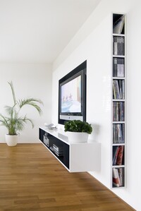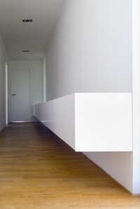 Vybavení novostavby rodinného domu. Tento interiér, kde jsou použity materiály jako sklo a hliník, nepůsobí chladným dojmem, díky vhodně zvolené dubové podlaze, která je v kuchyni doplněna ořechovou dýhou. V domě jsou použity doplňky značek: lustr Zettel a Campari light od Ingo Maurer, Lampa Tolomeo mega od Artemide a další.